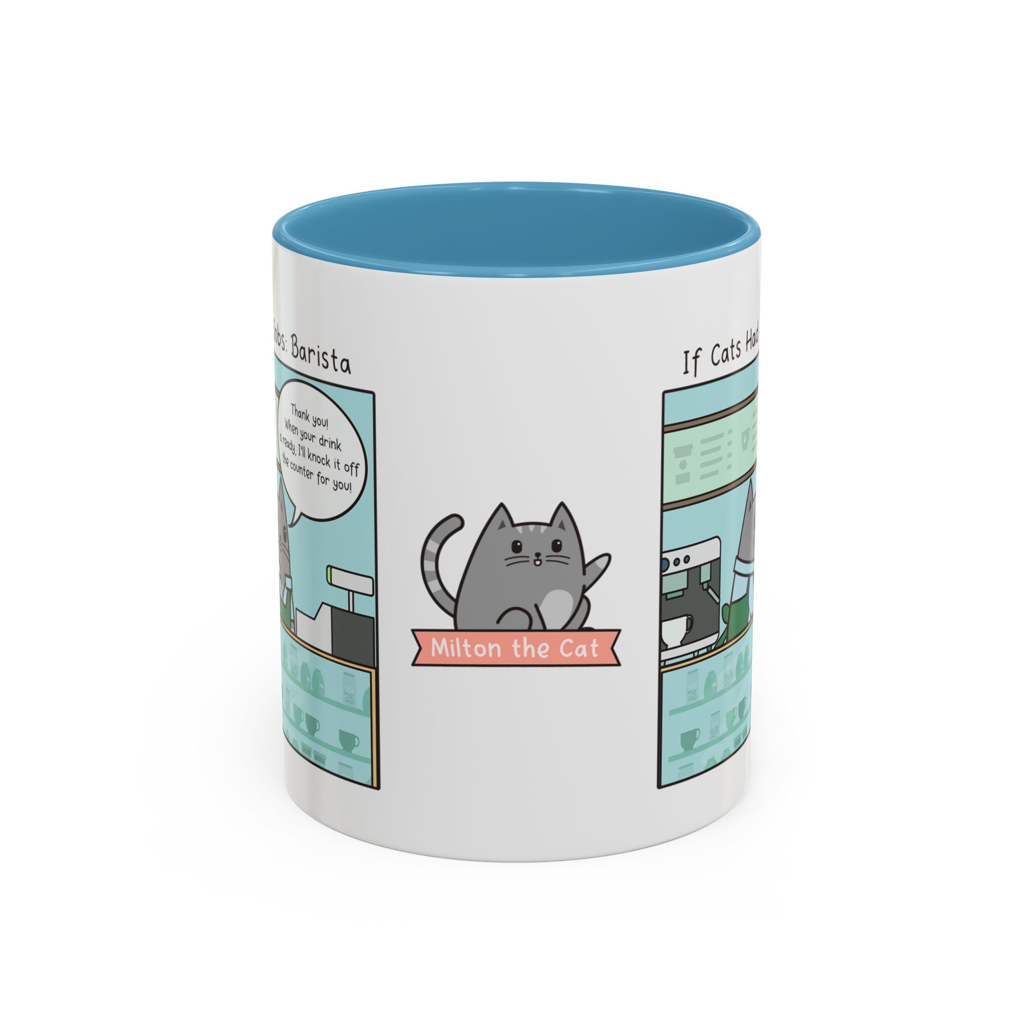 But the real star of this mug is the captivating comic strip starring Milton, the beloved character from the Milton the Cat webcomic. Join this tubby tabby as he takes on the role of a purr-fect barista, brewing up a bit of laughter...if your order ever makes it to you...and we hope you don't mind a bit of cat hair in your coffee.