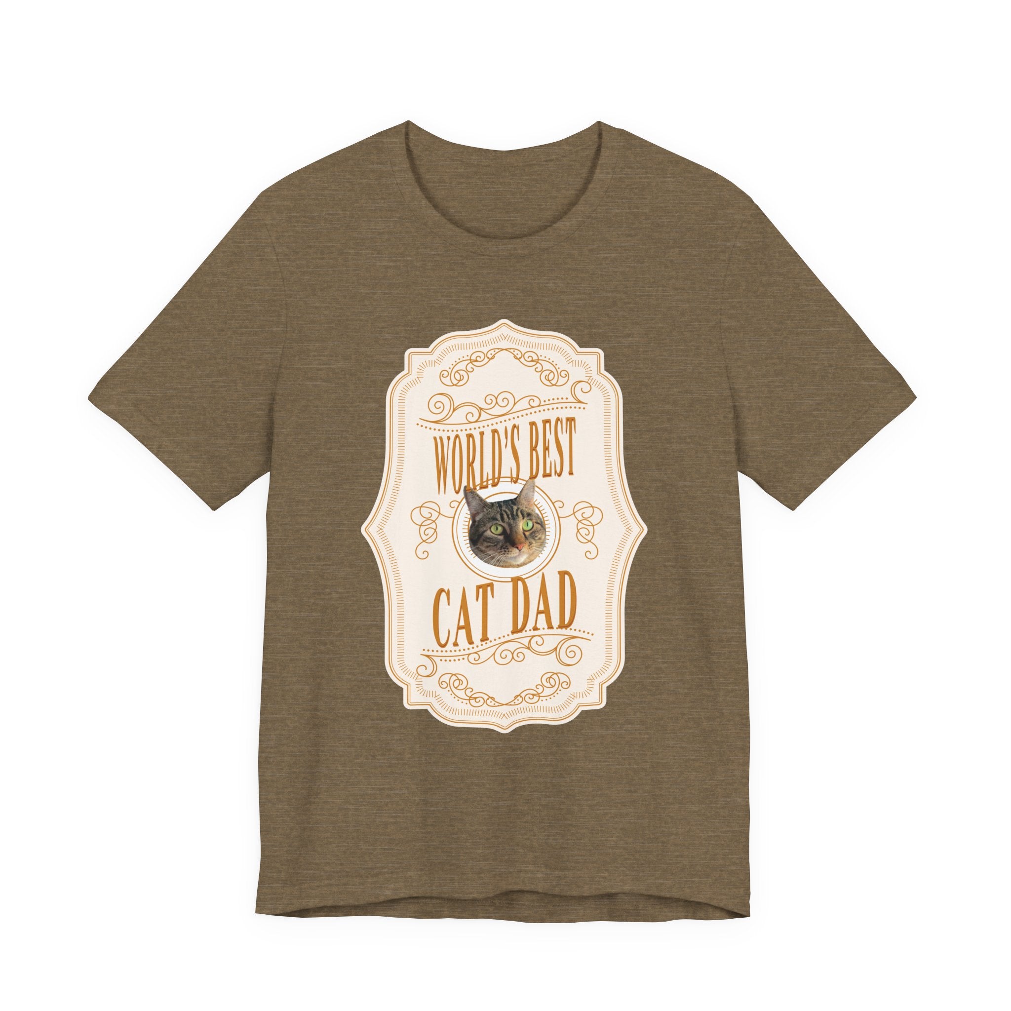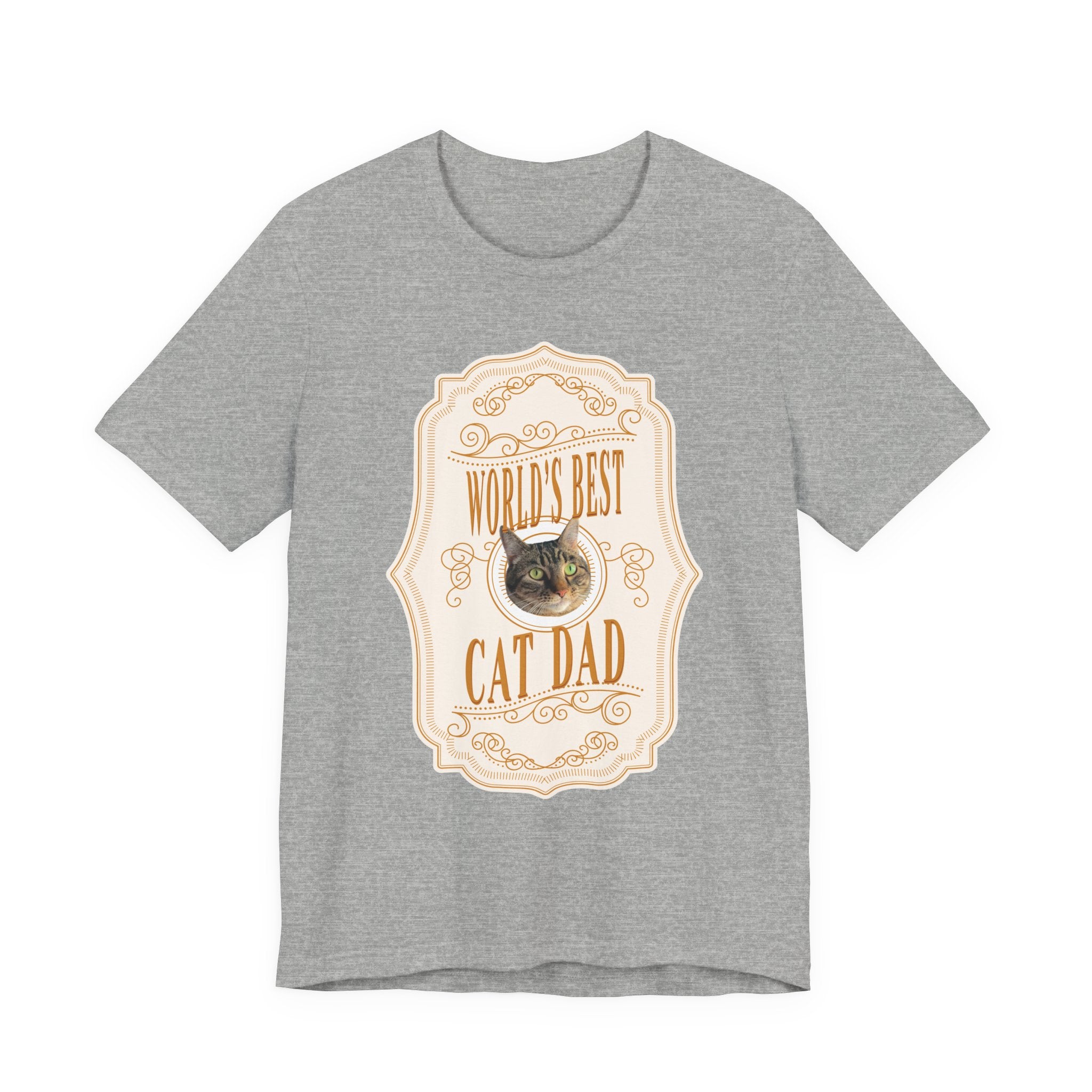On the prowl for a one-of-a-kind gift that will make your favorite cat dad purr with pride? Look no further. The Custom “World's Best Cat Dad” Whiskey Label T-Shirt turns their beloved kitty into the star of a bold whiskey label inspired design. Each shirt is custom printed with your cat’s adorable face, surrounded by the playful phrase “World's Best Cat Dad.”