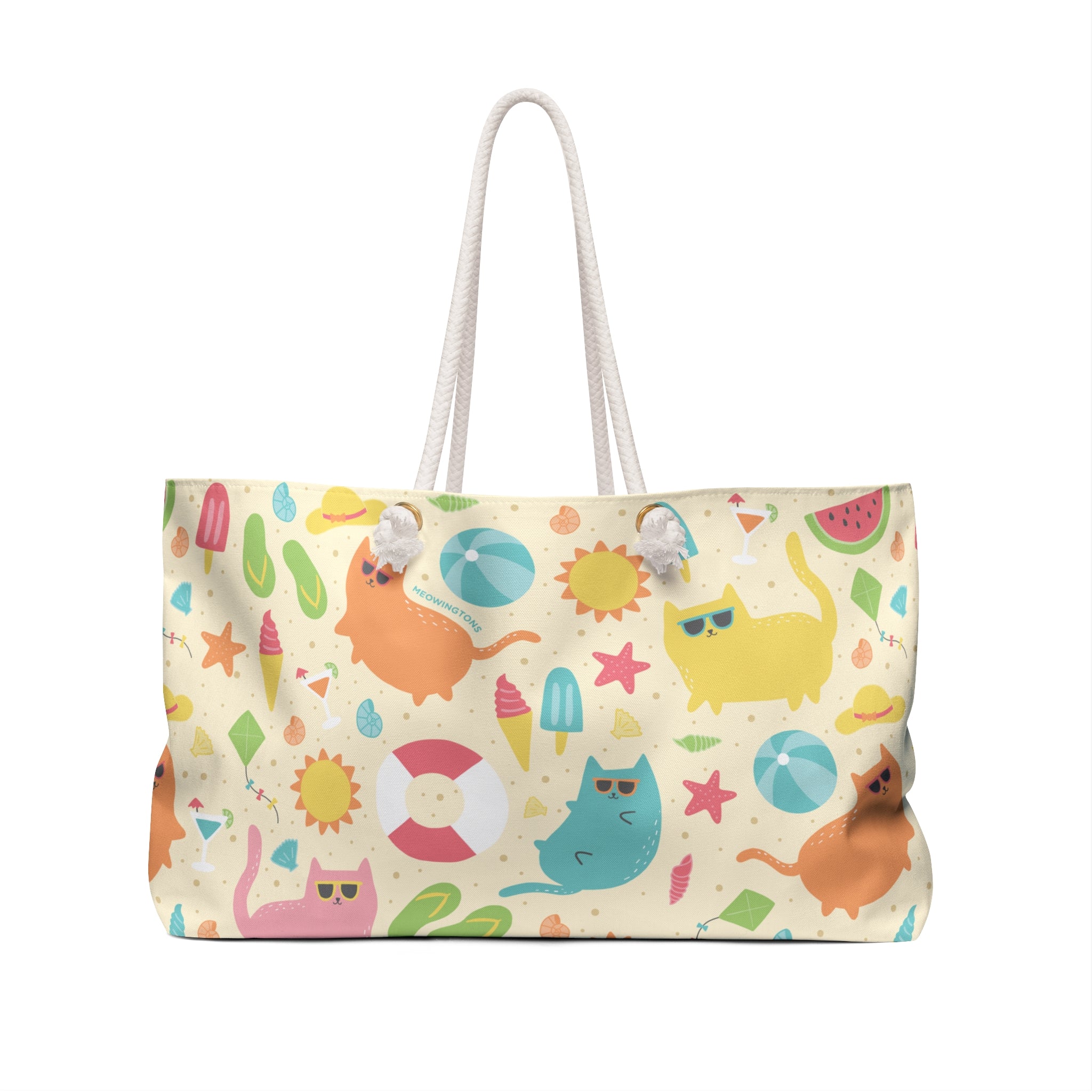 With its bright, multicolor cat print and knotted cotton rope handles, this open-top Weekender Beach Tote Bag will have you feline fine all summer long! Whether you're headed to the beachside or the poolside, this cute cat tote bag is large enough to hold all your summer essentials.